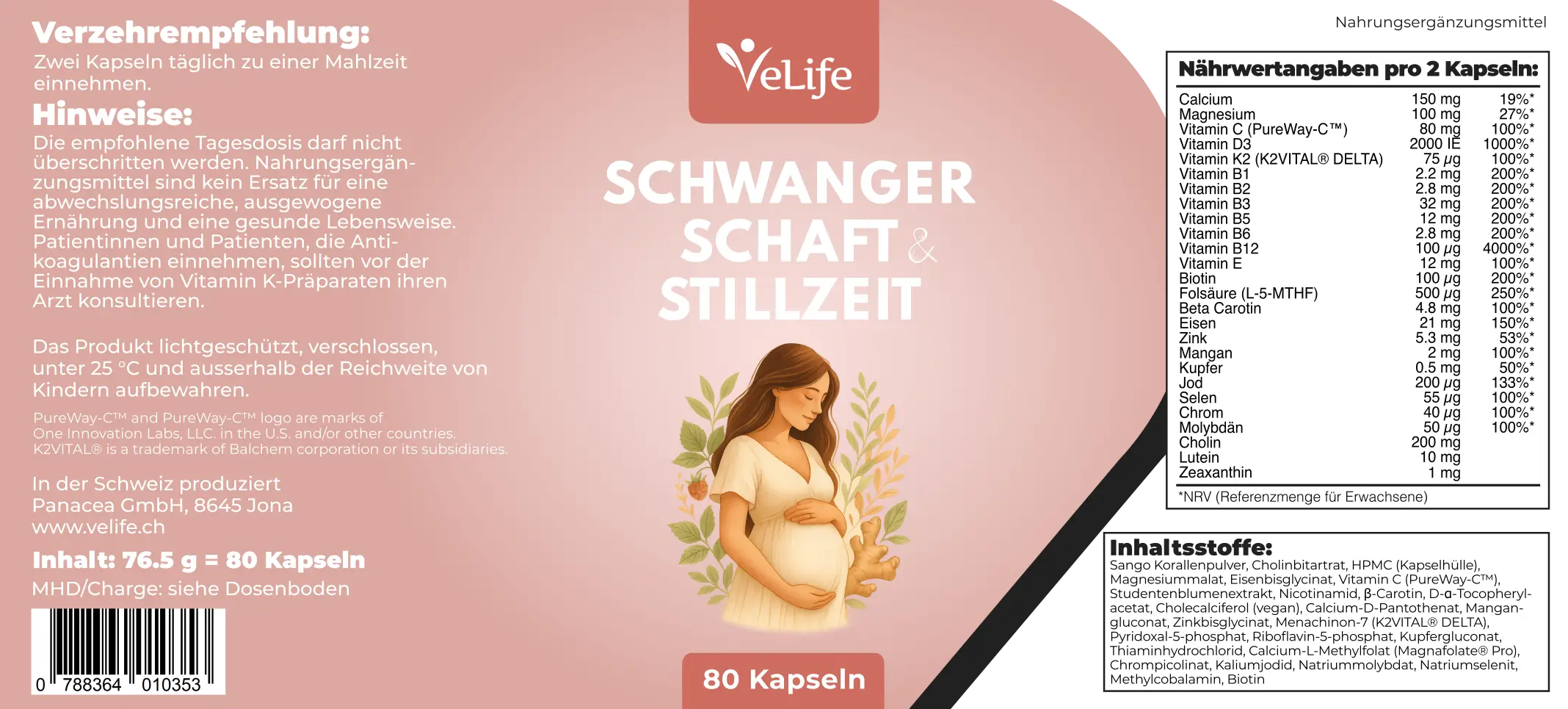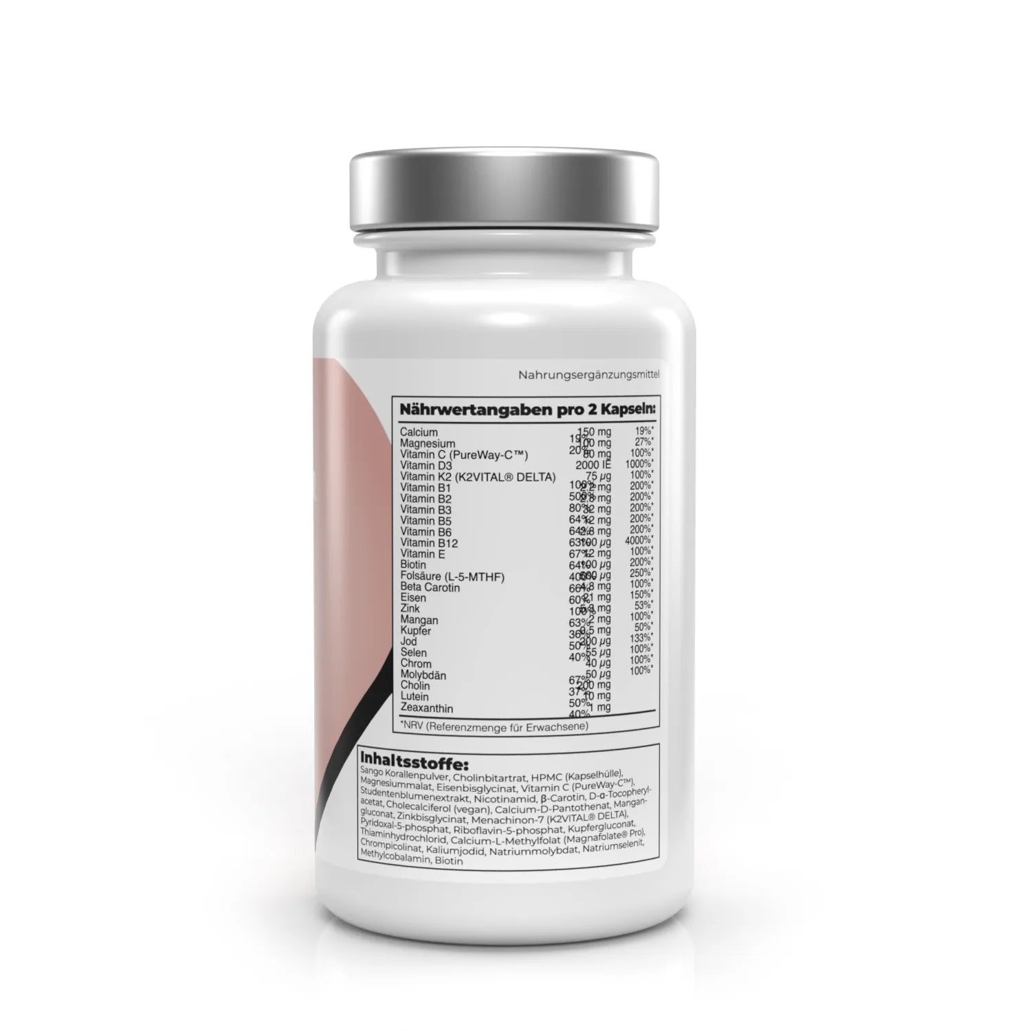 Sango Korallenpulver, Cholinbitartrat, HPMC (Kapselhülle), Magnesiummalat, Eisenbisglycinat, Vitamin C (PureWay-C™), Studentenblumenextrakt, Nicotinamid, β-Carotin, D-α-Tocopherylacetat, Cholecalciferol (vegan), Calcium-D-Pantothenat, Mangangluconat, Zinkbisglycinat, Menachinon-7 (K2VITAL® DELTA), Pyridoxal-5-phosphat, Riboflavin-5-phosphat, Kupfergluconat, Thiaminhydrochlorid, Calcium-L-Methylfolat (Magnafolate® Pro), Chrompicolinat, Kaliumjodid, Natriummolybdat, Natriumselenit, Methylcobalamin, Biotin