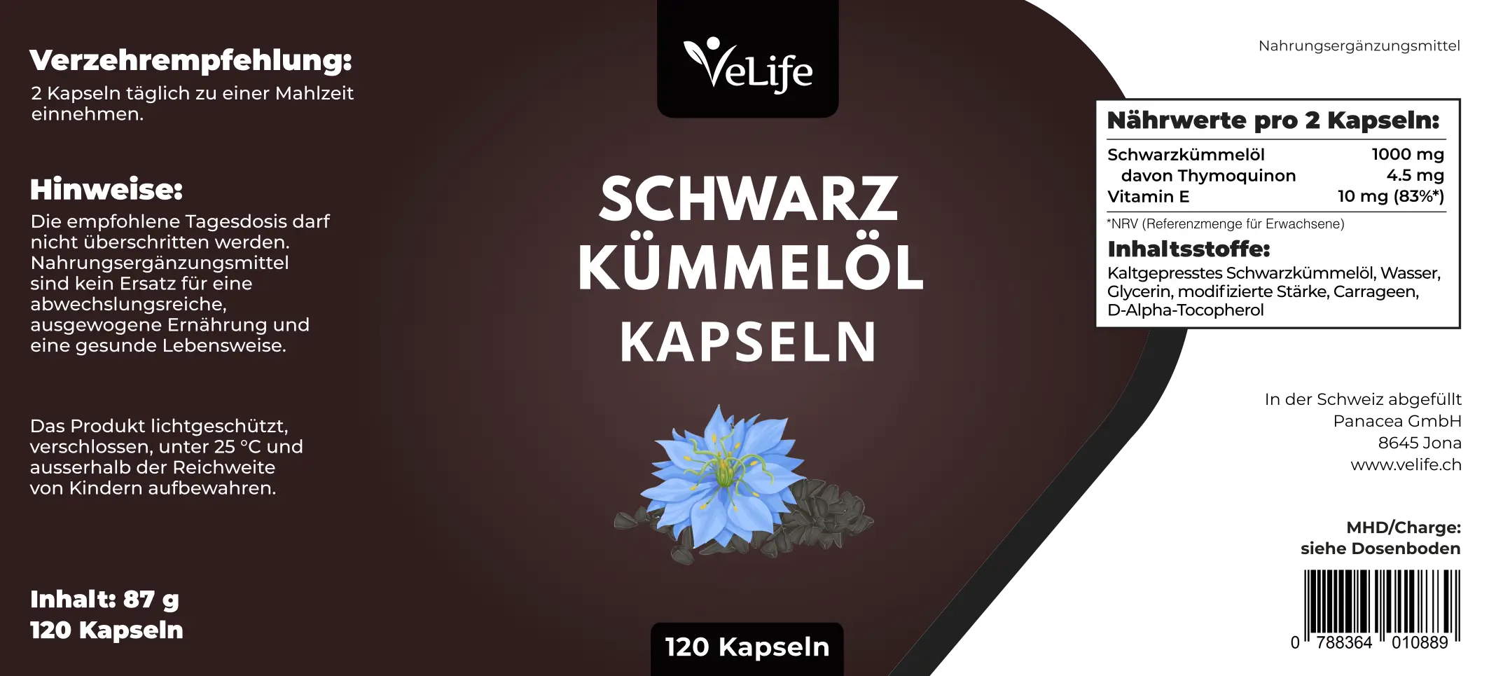 Kaltgepresstes Schwarzkümmelöl, Wasser, Glycerin, modifizierte Stärke, Carrageen, D-Alpha-Tocopherol