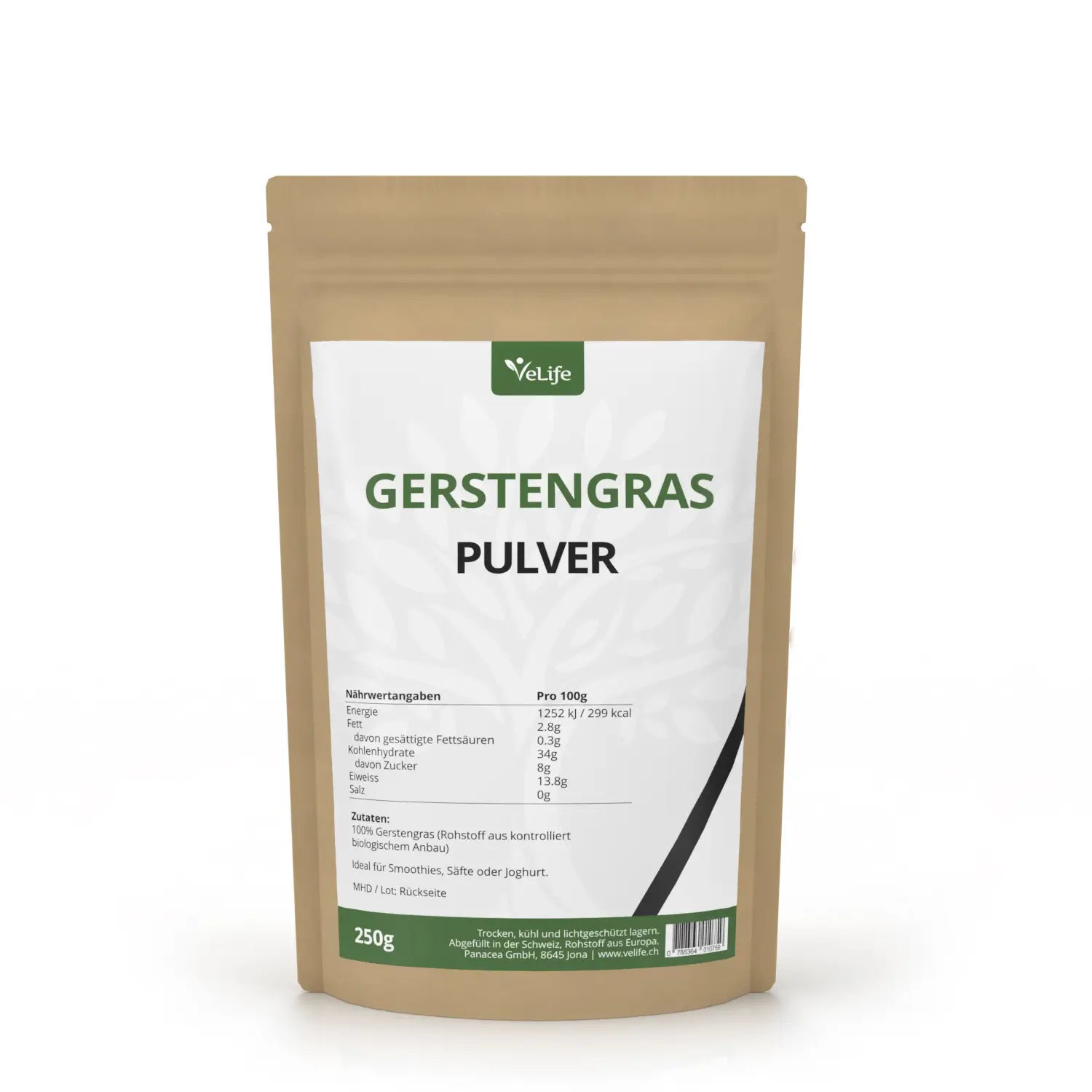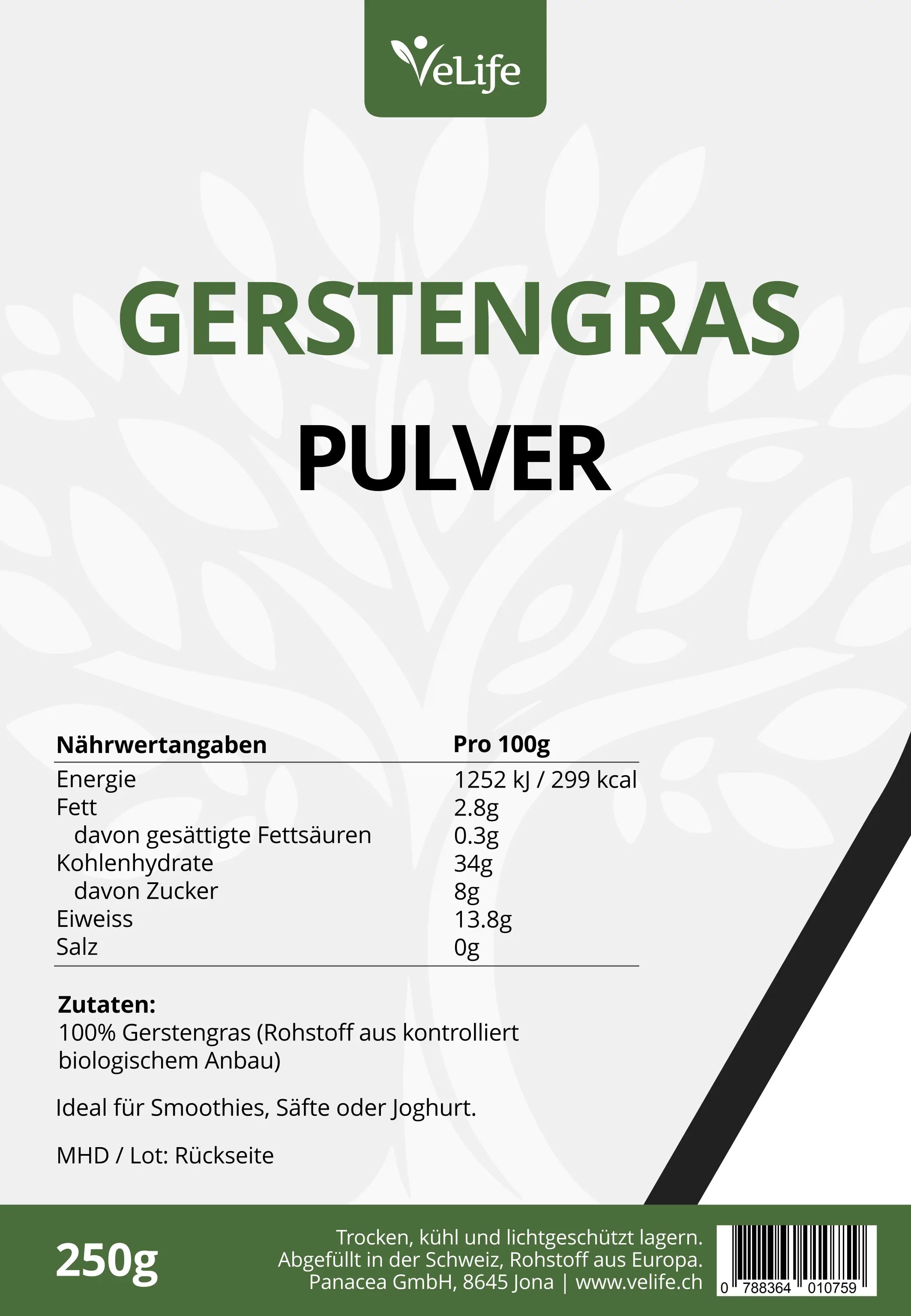 Das Gerstengras Pulver von Velife wird aus den jungen Trieben der Gerste in den ersten Monaten nach dem Keimen gewonnen. Diese frischen Triebe werden schonend getrocknet und fein gemahlen, wodurch die natürlichen Inhaltsstoffe erhalten bleiben. Sie können das Pulver einfach in Getränken, Shakes, Smoothies oder Müsli verwenden.